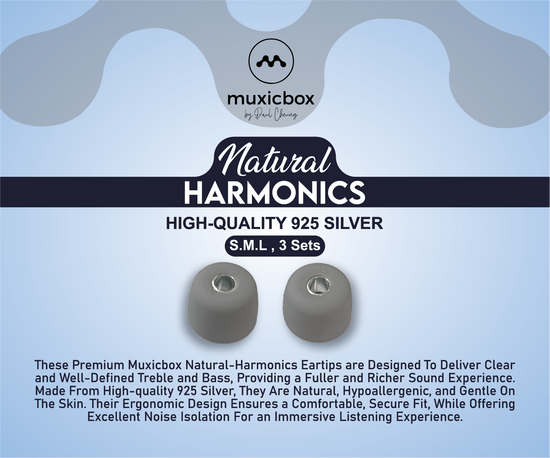 Experience superior sound quality with our premium Muxicbox Natural-Harmonics Eartips, crafted to deliver crystal-clear treble and deep, resonant bass for a richer, more immersive listening experience. One of the best eartips in the world. Made from high-quality 925 silver, these eartips are natural, hypoallergenic, and gentle on your skin, ensuring comfort with every use. No expense spared.